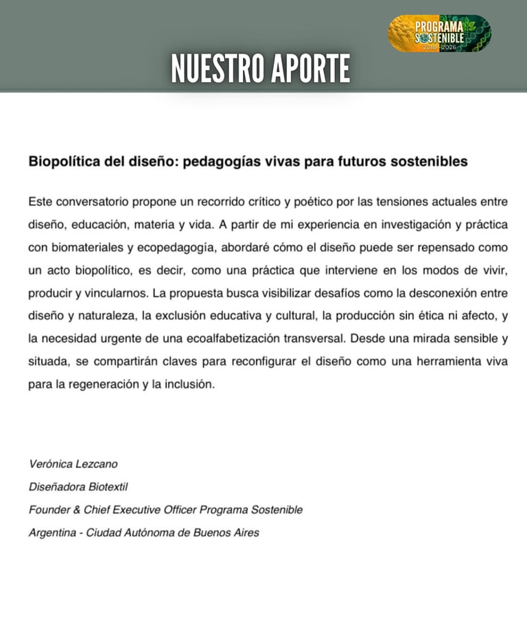 Desde la Dirección de Programa Sostenible, tuvimos el honor de participar activamente en este Simposio. Nuestro aporte se centró en el conversatorio: "Biopolítica del diseño: pedagogías vivas para futuros sostenibles". Esta propuesta —cuyos lineamientos se detallan en la página 32 del documento oficial— aborda la necesidad de repensar el diseño como una herramienta viva para la regeneración, la inclusión educativa y la ecoalfabetización transversal.